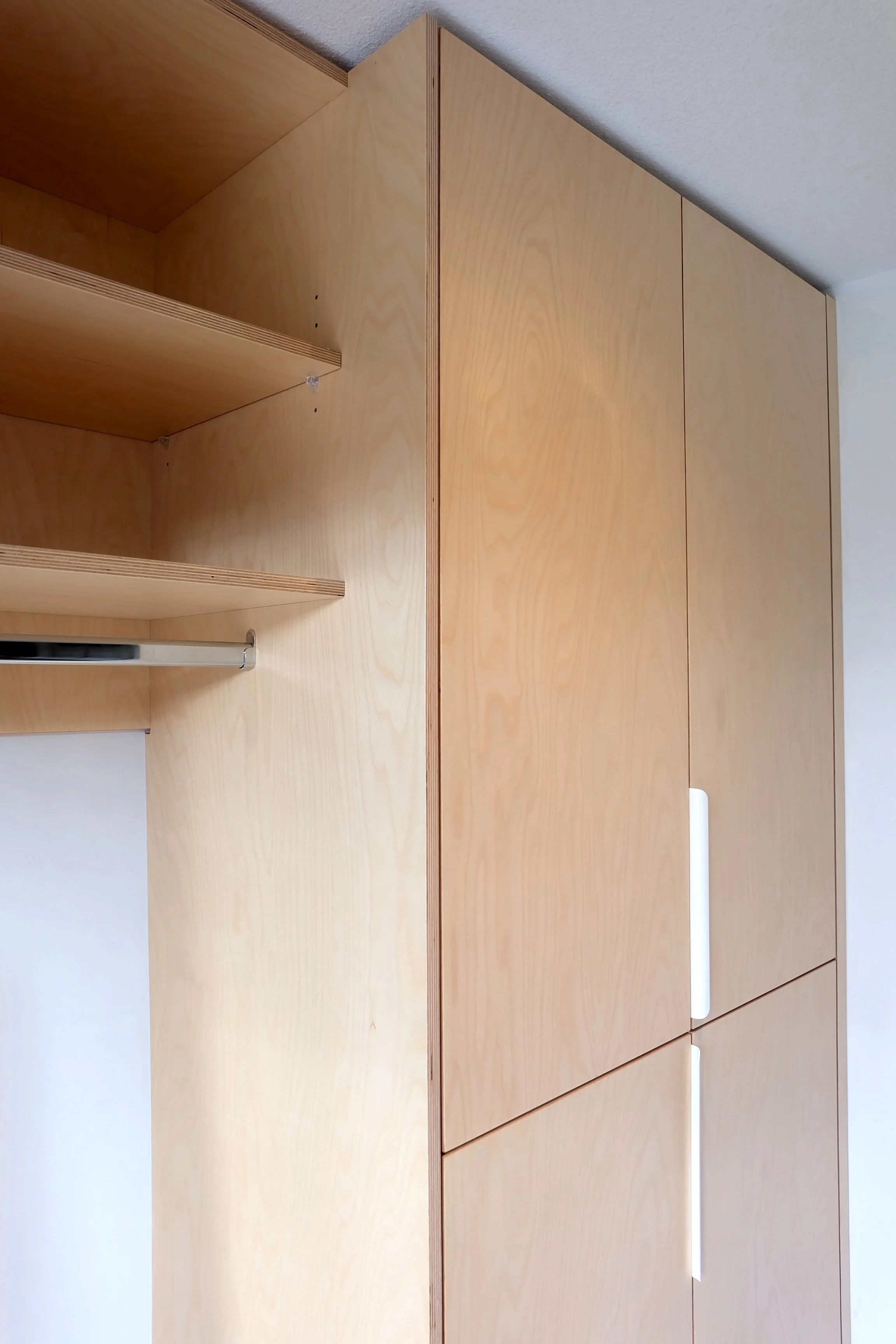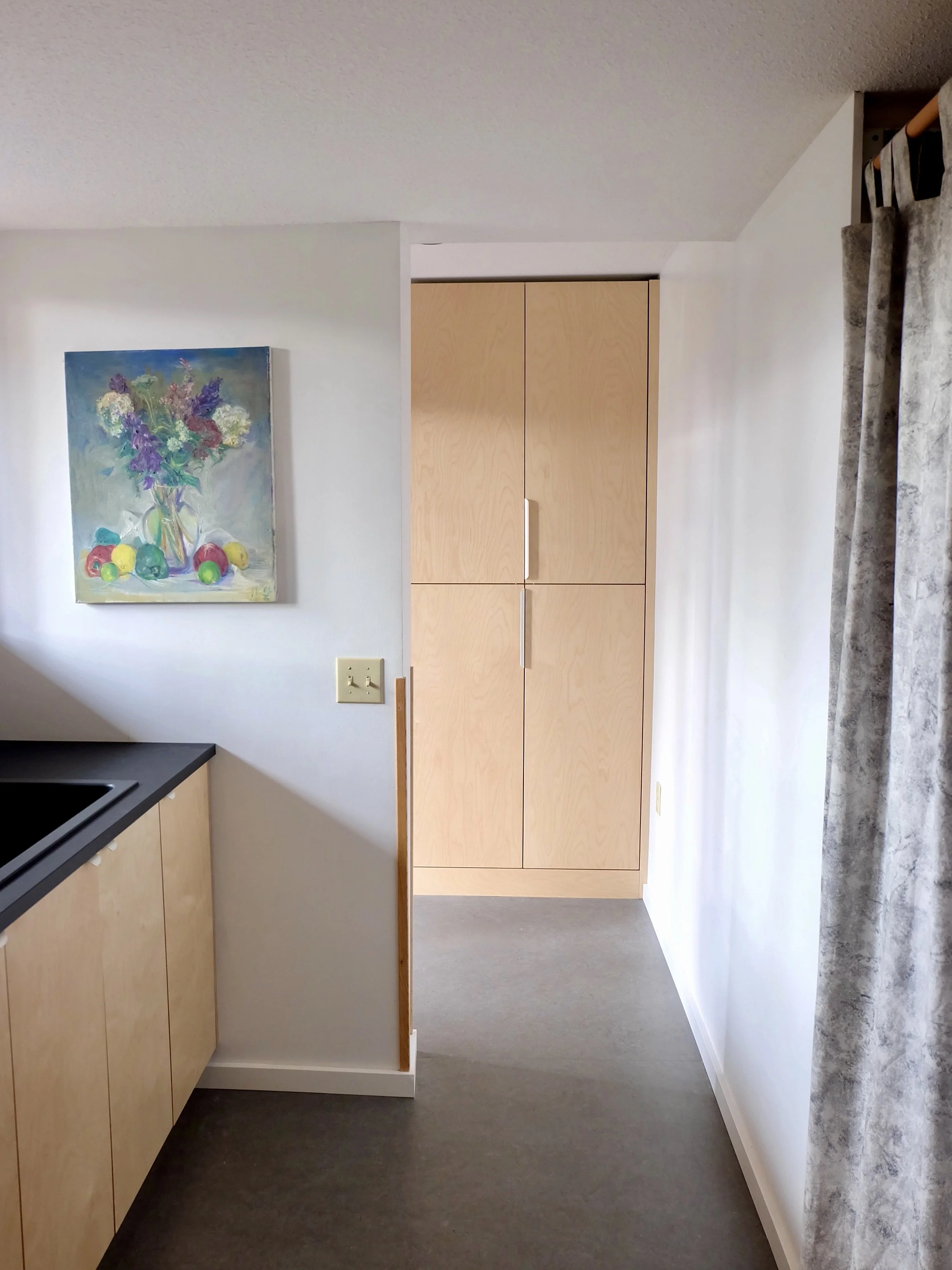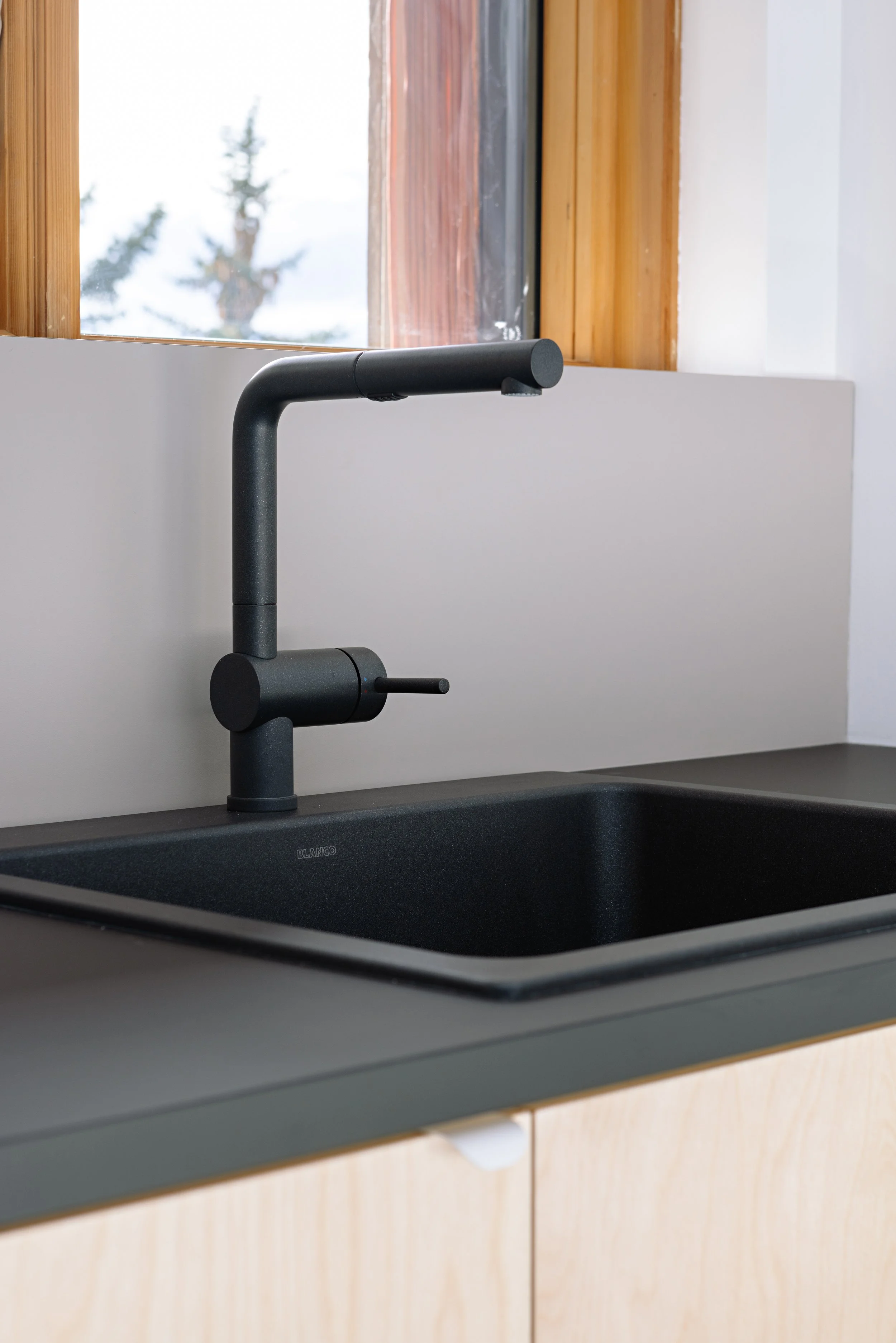 This laundry room was in need of a contemporary refresh. We opted for functional and durable materials such as Baltic birch plywood and laminate for a budget-friendly millwork upgrade. The addition of a two-tone laminate countertop and backsplash adds visual intrigue, while the inclusion of a monochromatic sink and faucet from Blanco elevates the overall aesthetic of this striking laundry room.